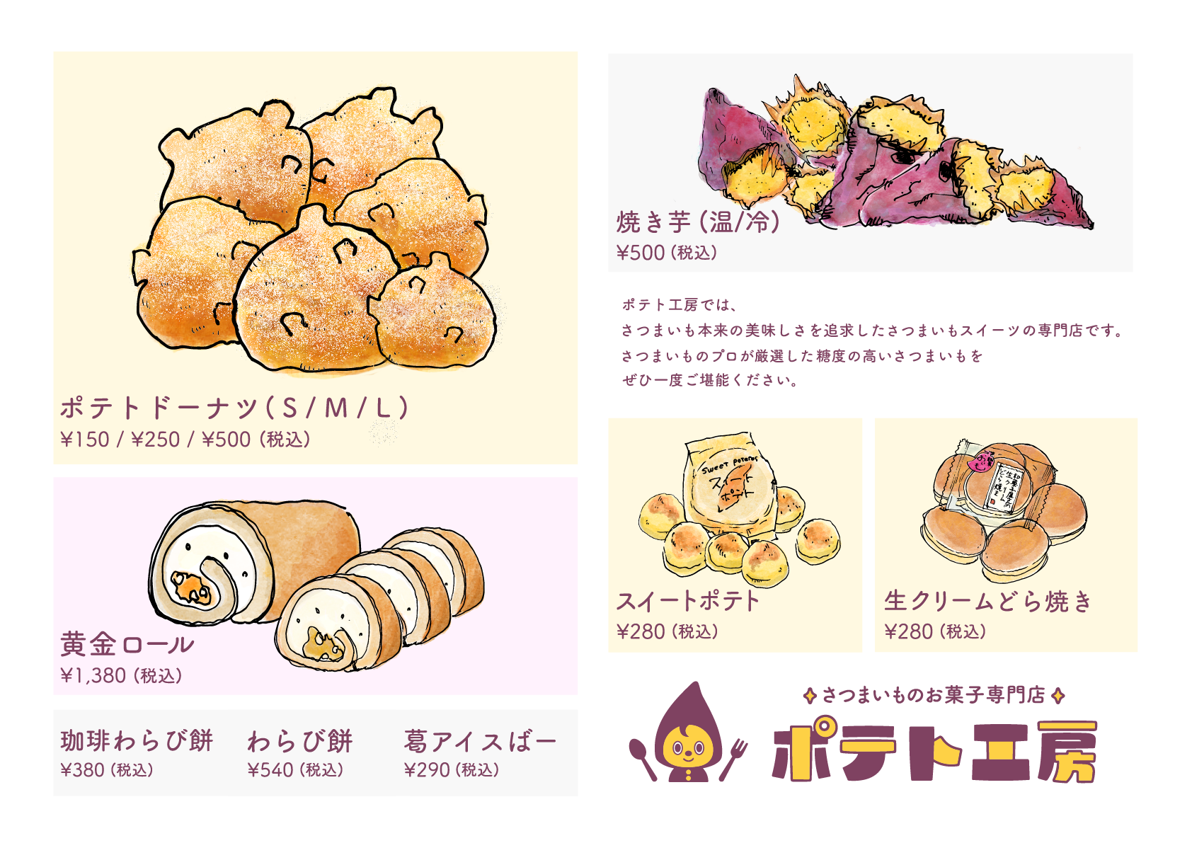 ポテト工房では、さつまいも本来の美味しさを追求したさつまいもスイーツ専門店です。さつまいものプロが厳選した糖度の高いさつまいもをぜひ一度ご堪能ください。